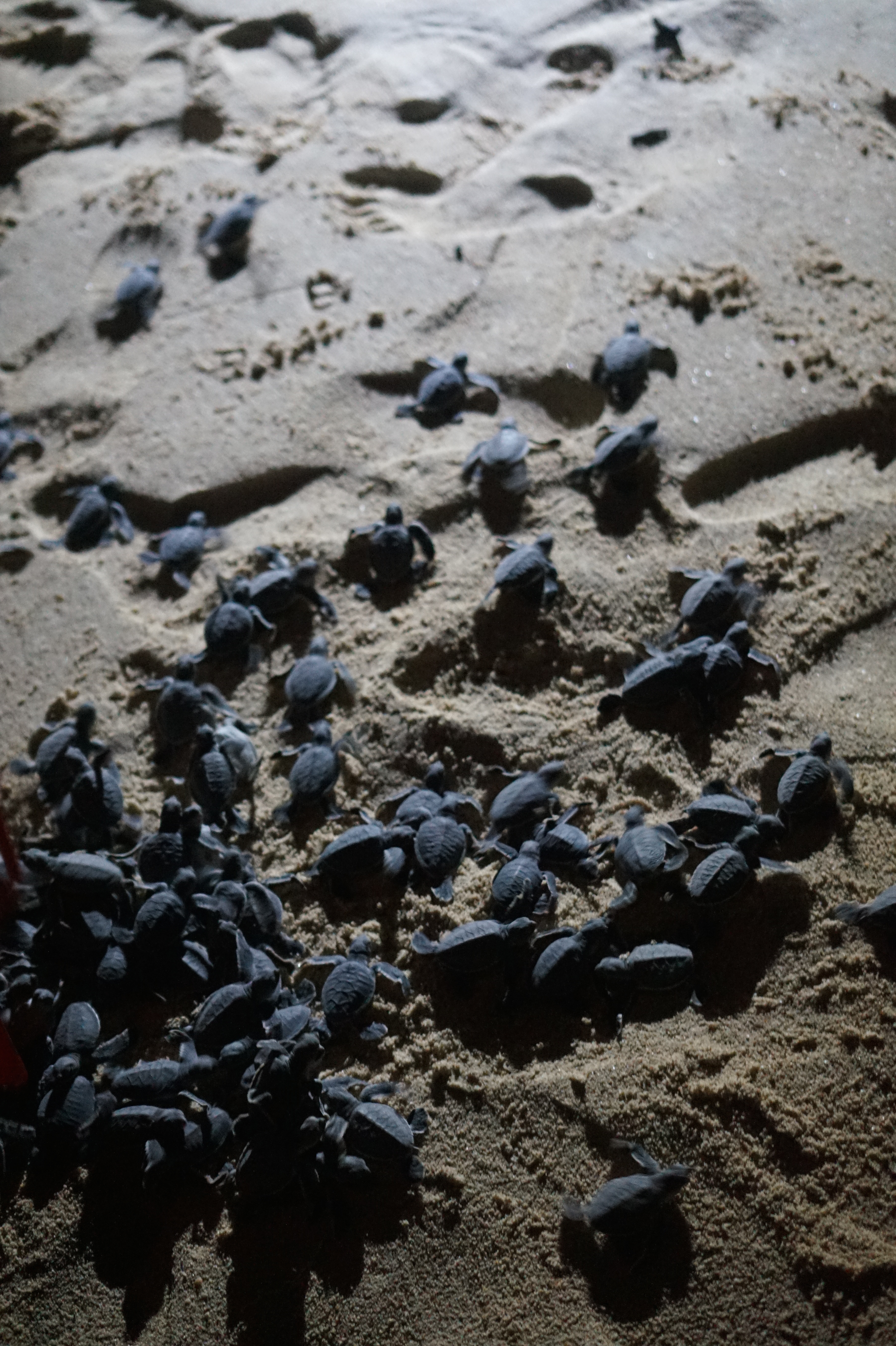 There is nothing to do on Turtle Island except sit on the beach by day (which we were doing when Julia casually said “oh Sharon, look”, at which point I turned round and leapt up at the “small” visitor checking us out)…and then in the dining room by night, waiting for the “turtle time” call. At which point you run to whichever part of the island the female turtle has landed on and made her nest. You watch the mother lay her eggs (72 in our case), which are promptly taken by the ranger. Once the mother has finished laying her eggs you are allowed to move to the front and take photos whilst the rangers measure her and clean her up.